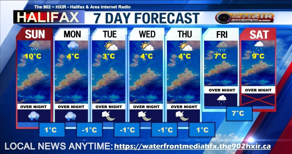 Cloudy. Rain beginning early this morning and ending this afternoon. Amount 10 to 20 mm. Wind southwest 20 km/h gusting to 40 becoming southeast 40 gusting to 70 this morning then southwest 20 gusting to 40 this afternoon. High 10.