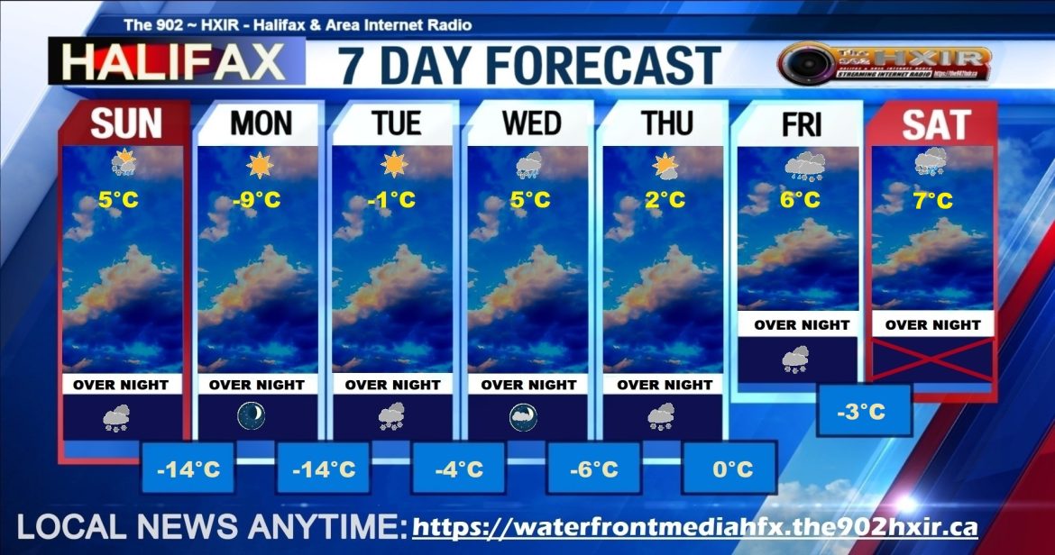 | Tonight | Flurries ending late this evening then partly cloudy. Amount 2 cm. Wind north 30 km/h gusting to 50 becoming northwest 20 gusting to 40 after midnight. Low minus 13. Wind chill minus 21 overnight. |